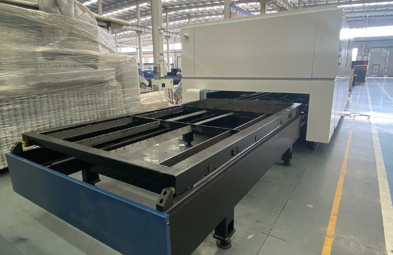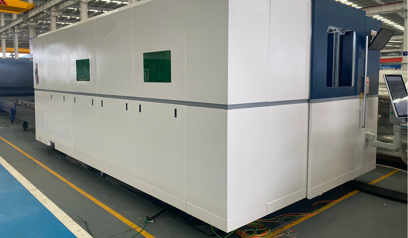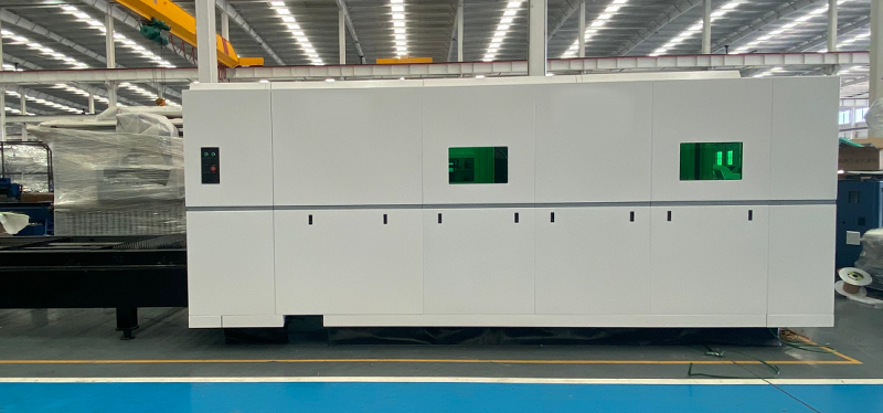 Современный лазерный раскройный комплекс с кабинетной защитой и автосменой столов.